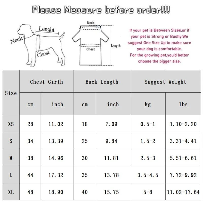 XL: Chest 48cm/18.9” ; Length 40cm/15.75” ; Suggest Weight 5-8 kg/11.02-17.64 lbs.