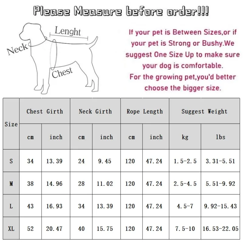 XL: Chest 52cm/20.47” ; Neck 40cm/15.75” ; Length 120cm/47.24”; Suggest Weight 7.5-10 kg/16.53-22.05 lbs.