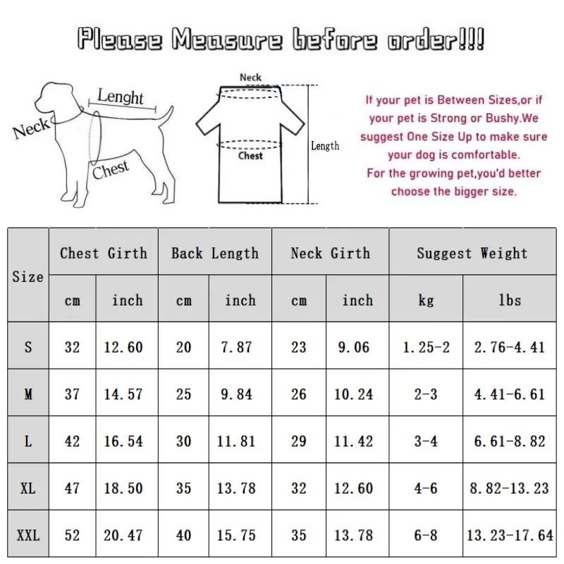 XXL: Chest 52cm/20.47” ; Length 40cm/15.75” ; Neck 35cm/13.78” ; Suggest Weight 6-9 kg/13.23-17.64 lbs.