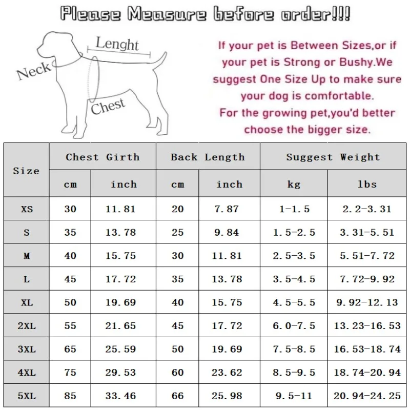 5XL Chest 85cm/33.46” Length 66cm/25.98” Suggest Weight 9.5-11 kg/20.94-24.25 lbs