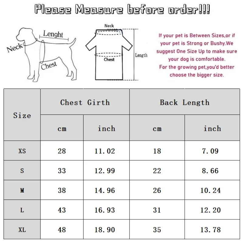 M: Chest 38cm/14.96” ; Length 26cm/10.24” .