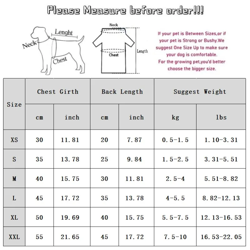 XL: Chest 50cm/19.69” ; Length 40cm/15.75” ;Suggest Weight 5.5-7.5 kg/12.13-16.53 lbs.