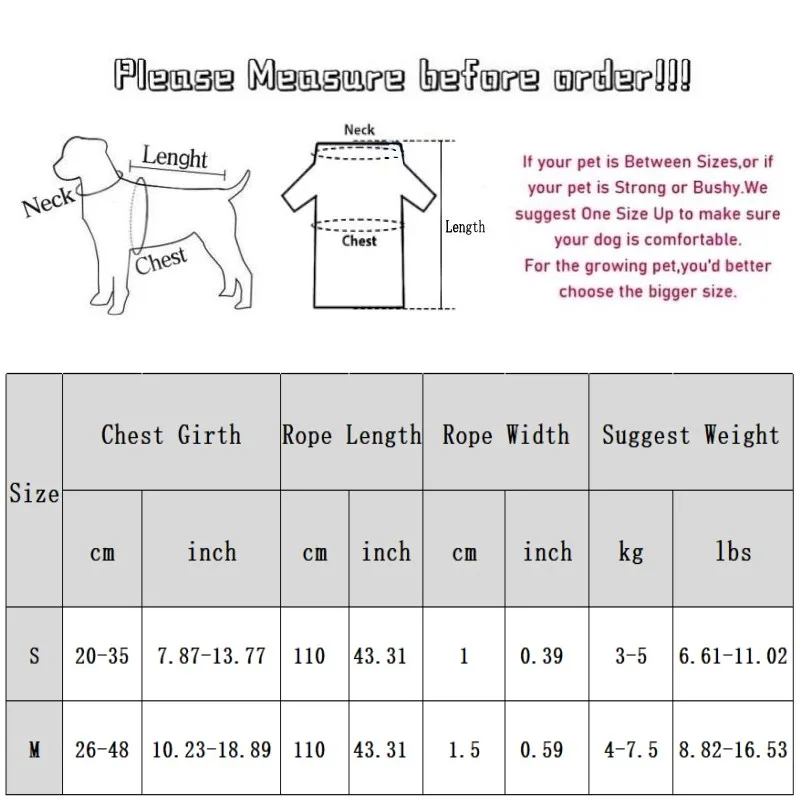 M: Chest 26-48cm/10.23-18.89” ; Length 110cm/43.31”; Width 1.5cm/0.59” ; Suggest Weight 3-7.5 kg/6.61-16.53 lbs.