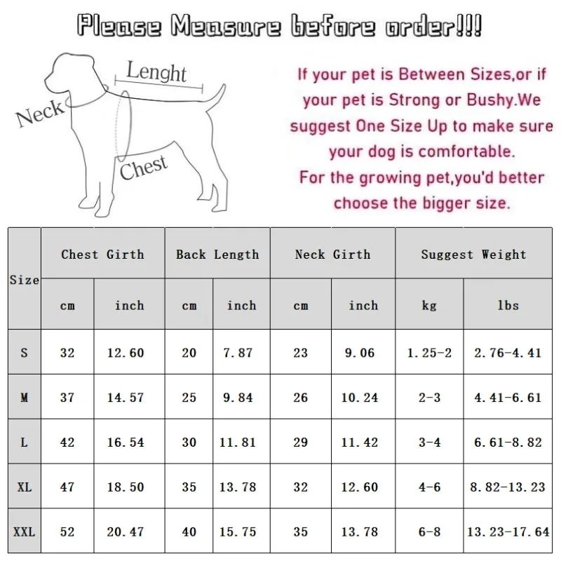 XXL: Chest 52cm/20.47” ; Length 40cm/15.75” ; Neck 35cm/13.78” ; Suggest Weight 6-9 kg/13.23-17.64 lbs.