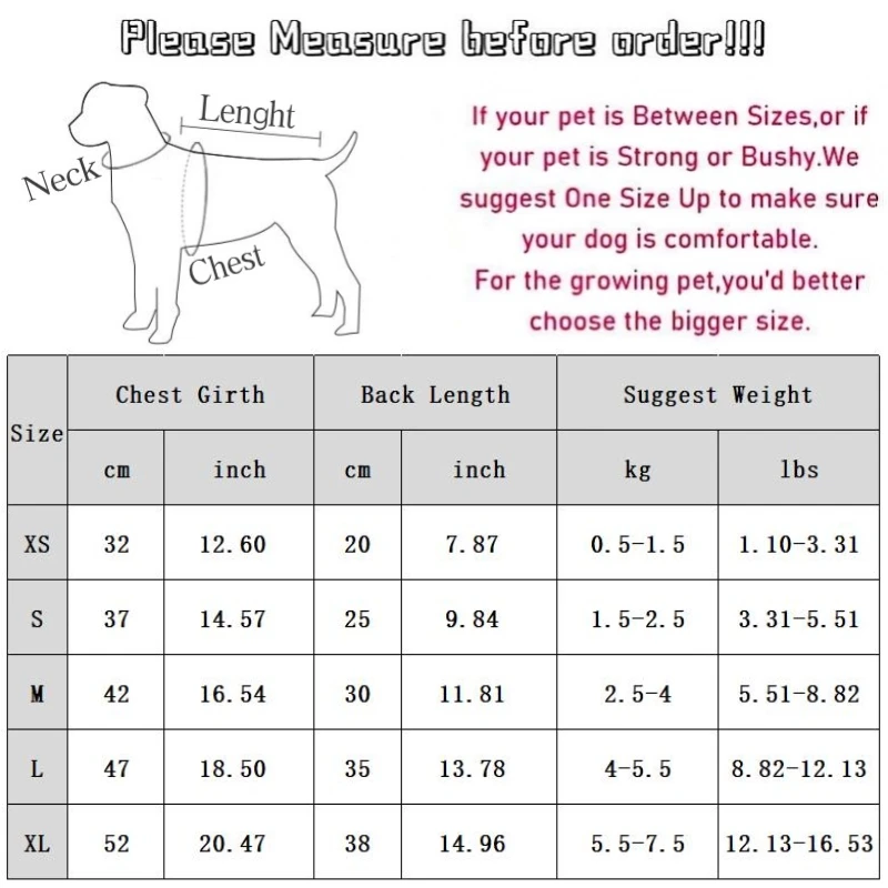 XL Chest Girth 52cm/20.47” ; Back Length 38cm/14.96” ; Suggest Weight 5.5-7.5kg/12.13-16.53 lbs