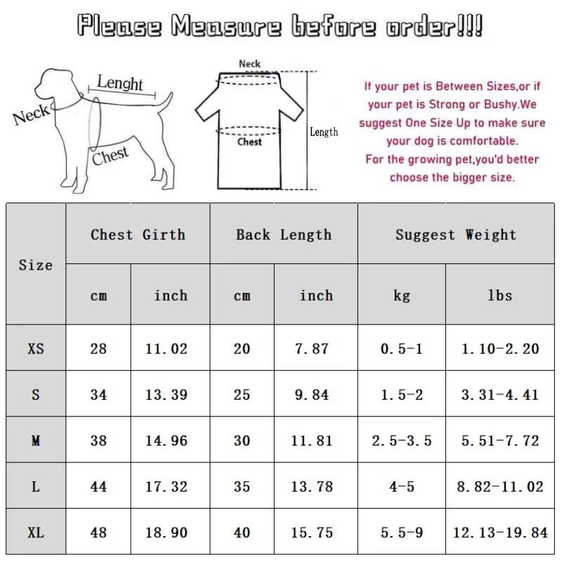 XL: Chest 48cm/18.9” ; Length 40cm/15.75” ; Suggest Weight 5-8 kg/11.02-17.64 lbs.