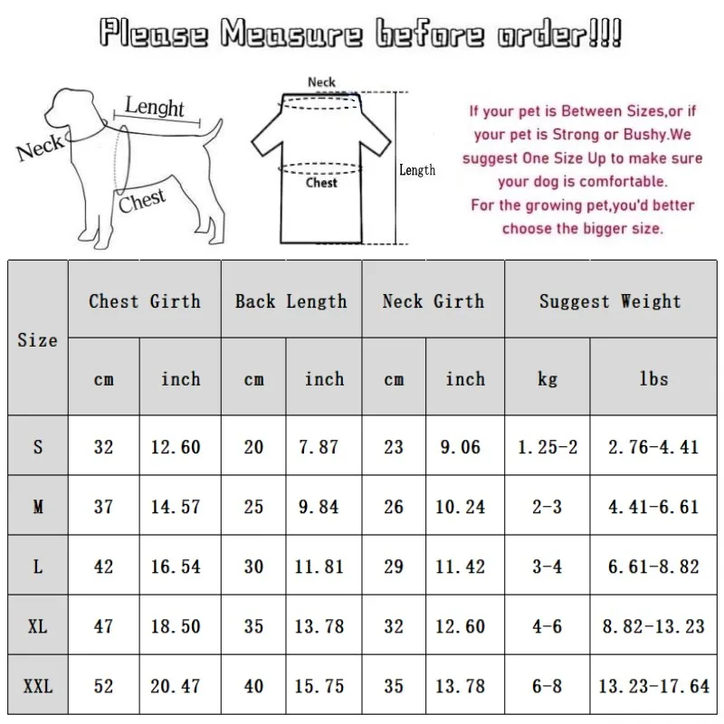 XL: Chest 47cm/18.5” ; Length 35cm/13.78” ; Neck 32cm/12.6” ; Suggest Weight 4-6 kg/8.82-13.23 lbs.